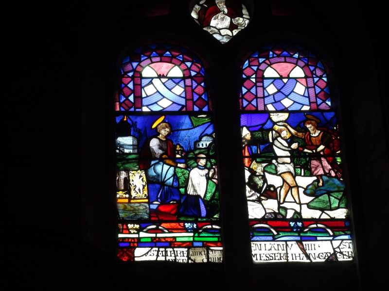 Dans la lancette de gauche, un donateur présenté par son Saint protecteur est agenouillé. La scène se déroule devant un arrière-plan paysagé. Dans la lancette de droite, Saint Jean-Baptiste baptise le Christ dans les eaux du Jourdain. L’inscription en bas des vitraux mentionne le donateur, Messire Jehan Gauger et la date de 1554.